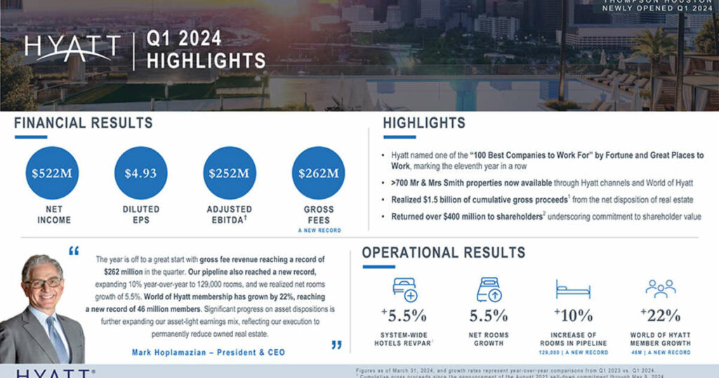 CHICAGO – Hyatt Hotels Corporation (“Hyatt” or the “Company”) (NYSE: H) reported first quarter 2024 results. Highlights include: Comparable system-wide […]