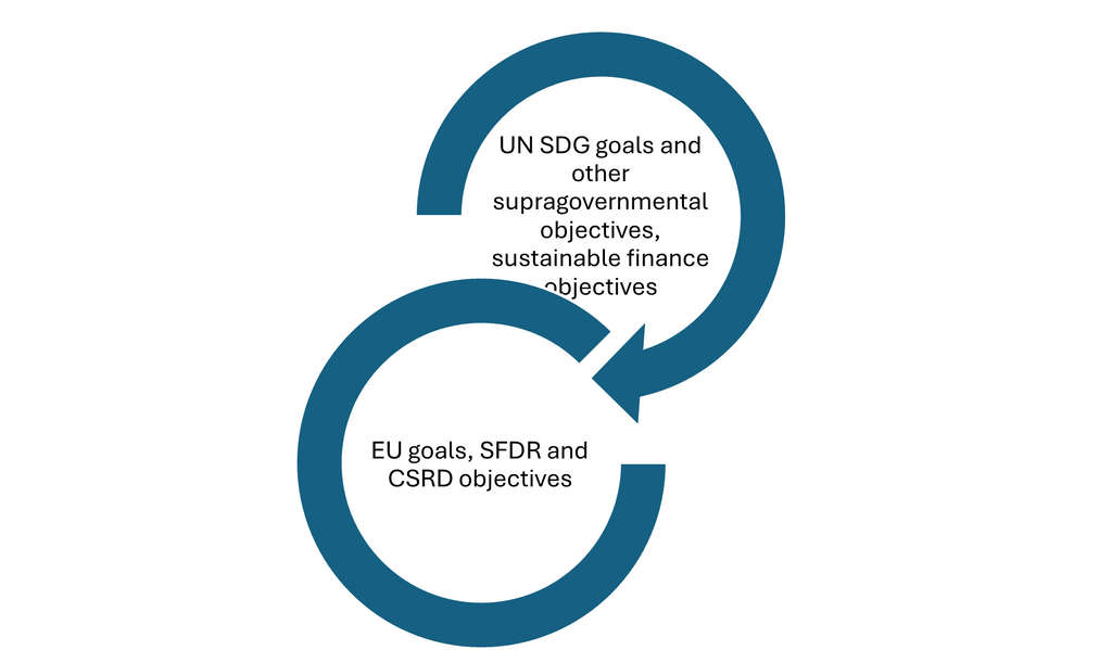 As you can see, the scopes and objectives are different, but they both support a comprehensive and integrated approach to enhancing corporate sustainability and sustainable finance through this interconnected regulatory approach (Figure 2). Meanwhile, the supragovernmental objectives (such as the UN SDG goals) are not legally binding, but countries are expected to cooperate and voluntarily integrate the goals into their national strategy, the EU-created CSRD and SFRD are legally binding obligations. In one of the next articles, we will see how the Action Plan on Financing Sustainable Growth, the EU Green Deal and others are connected. Stay tuned for the next episode.